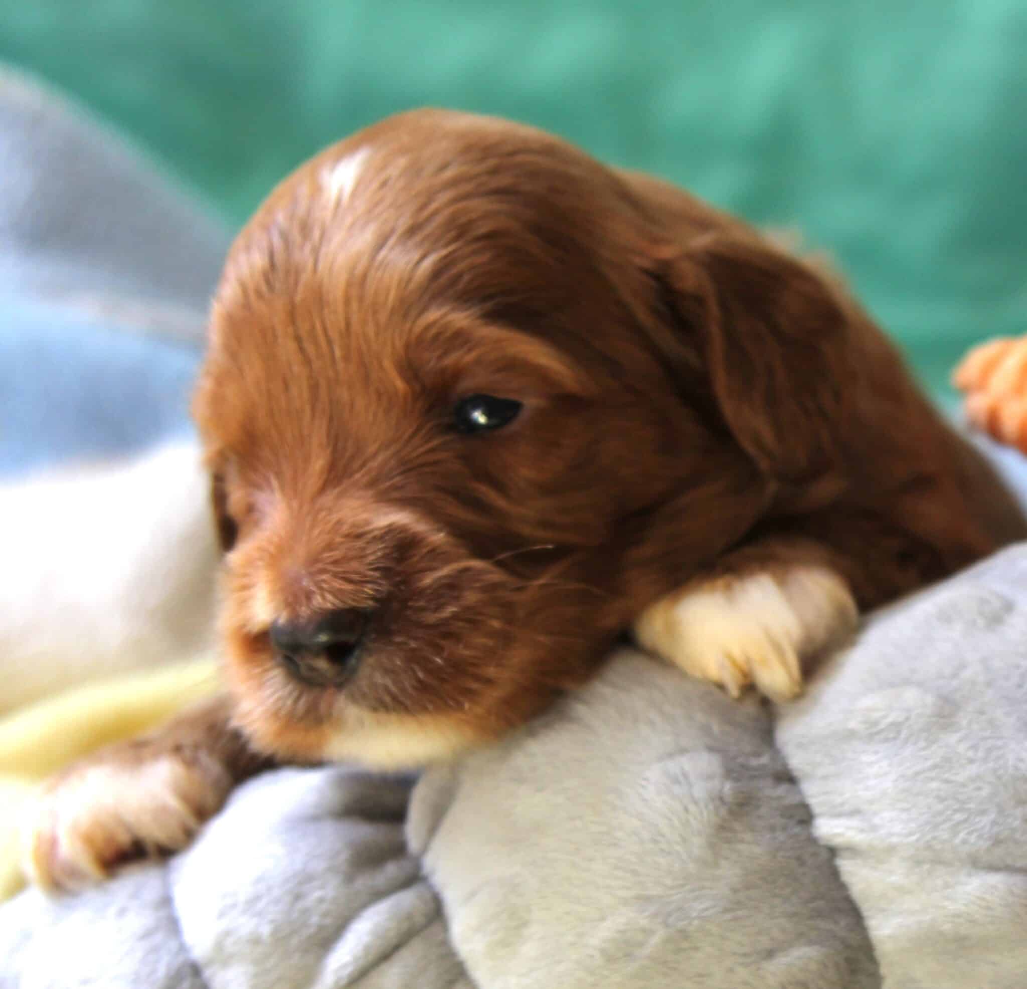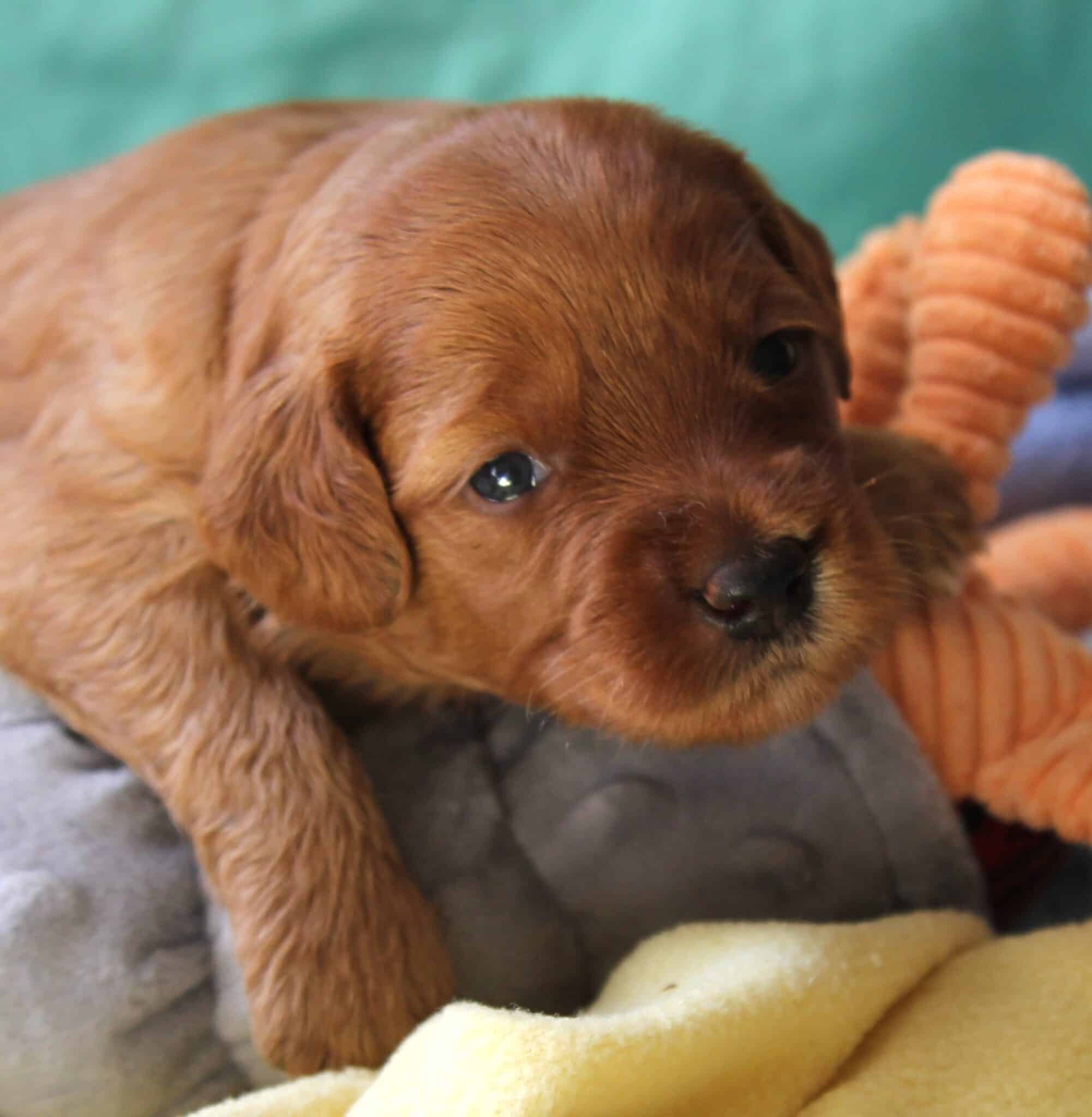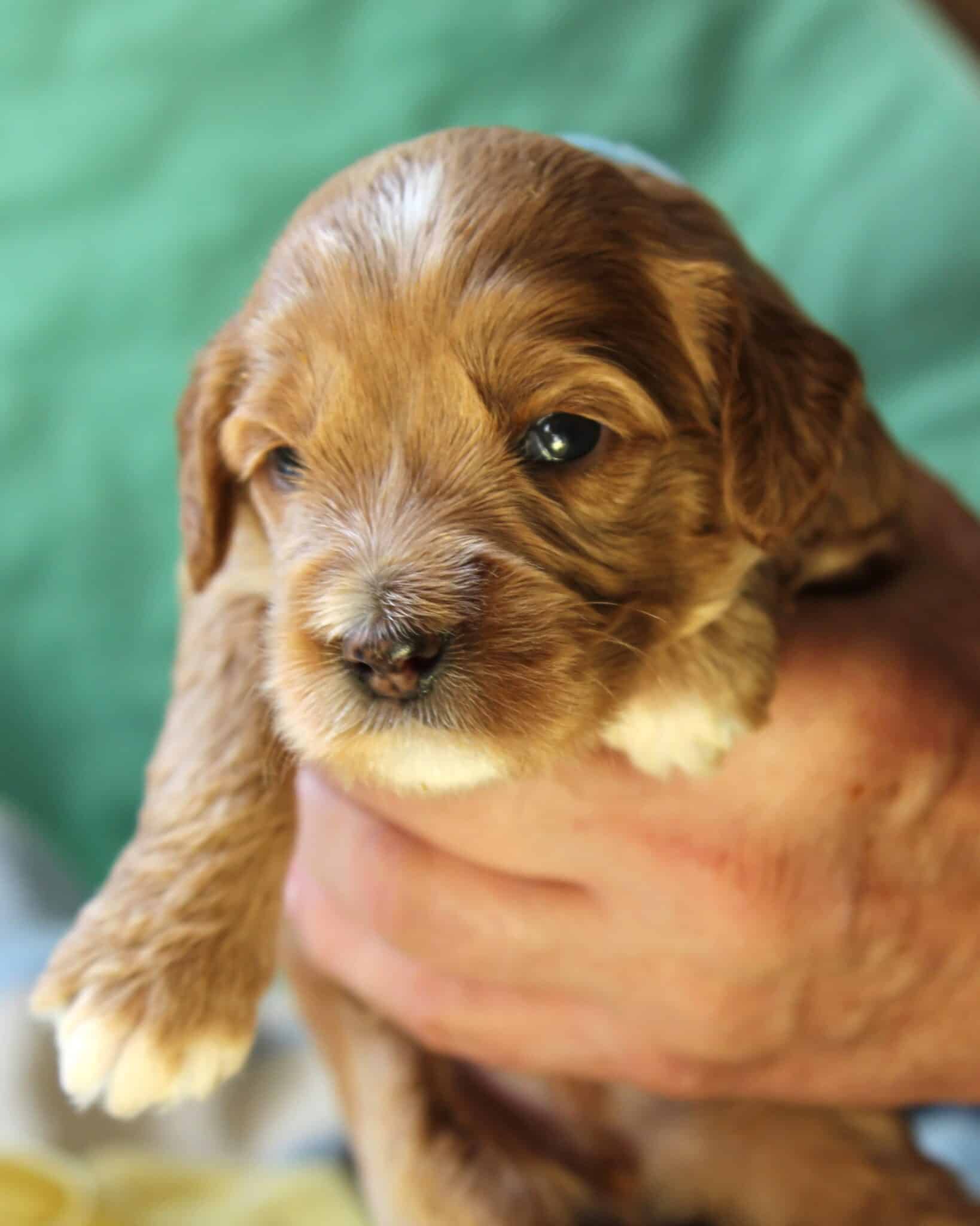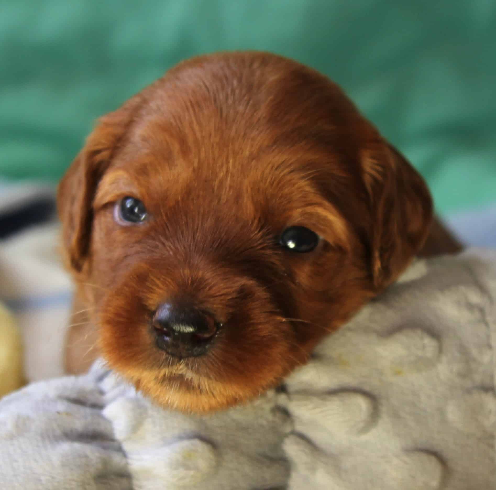 Medium (30-40 lbs) 18 inches at the withers at maturity. Both parents are registered F1b Multigenerational Australian Labradoodles ; Soft wavy fleece, non to low shedding, no odor, allergy friendly coats. (Please note the silky soft straight/wavy hair) A rainbow of reds, golden reds to red reds, some with white markings; adorable, playful, and will be well socialized, early house trained, use pet doors and stairs and love everyone, human and canine alike. Born early 09/11/ 2025. They will have their immunizations, microchip, veterinarian health check, and ready for their new families the last week of October/ first week in November Priced $3500