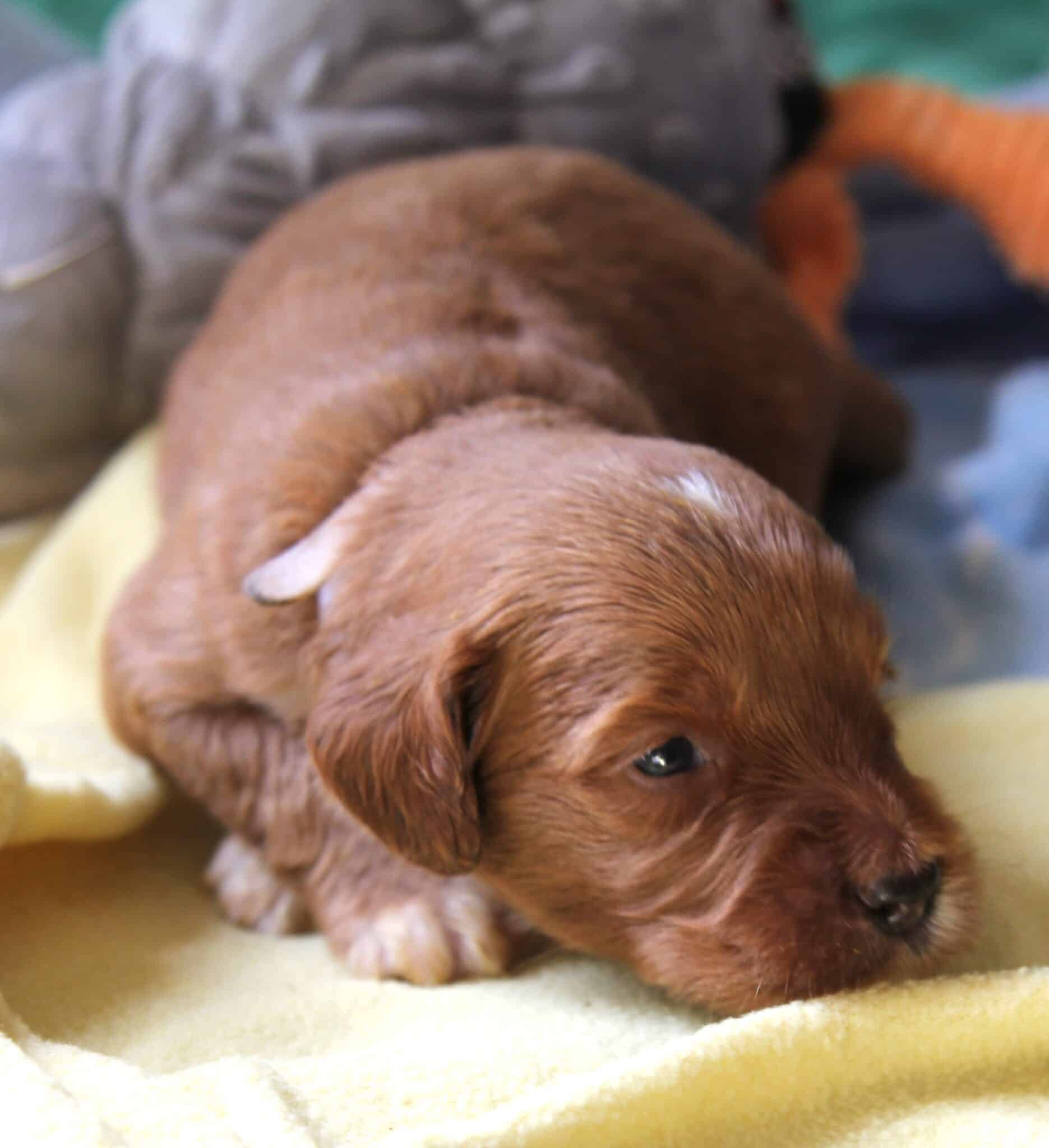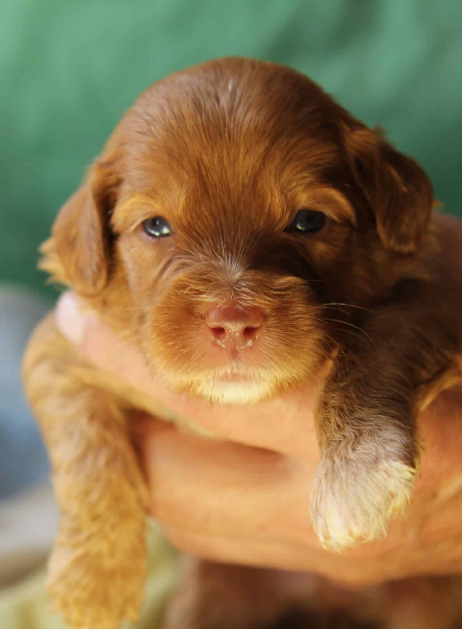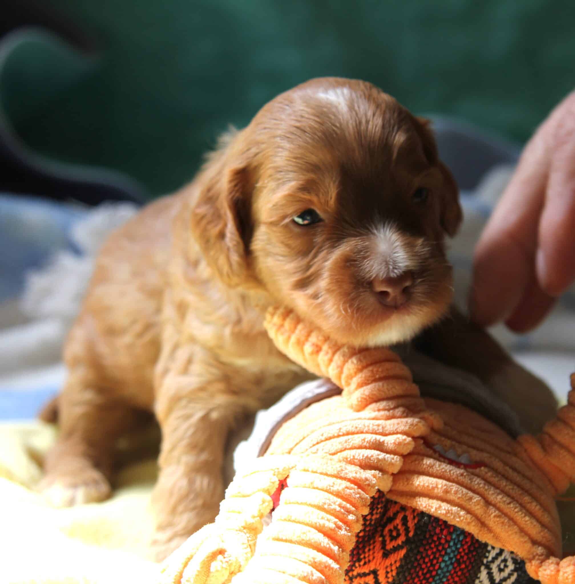 Medium (30-40 lbs) 18 inches at the withers at maturity. Both parents are registered F1b Multigenerational Australian Labradoodles ; Soft wavy fleece, non to low shedding, no odor, allergy friendly coats. (Please note the silky soft straight/wavy hair) A rainbow of reds, golden reds to red reds, some with white markings; adorable, playful, and will be well socialized, early house trained, use pet doors and stairs and love everyone, human and canine alike. Born early 09/11/ 2025. They will have their immunizations, microchip, veterinarian health check, and ready for their new families the last week of October/ first week in November Priced $3500
