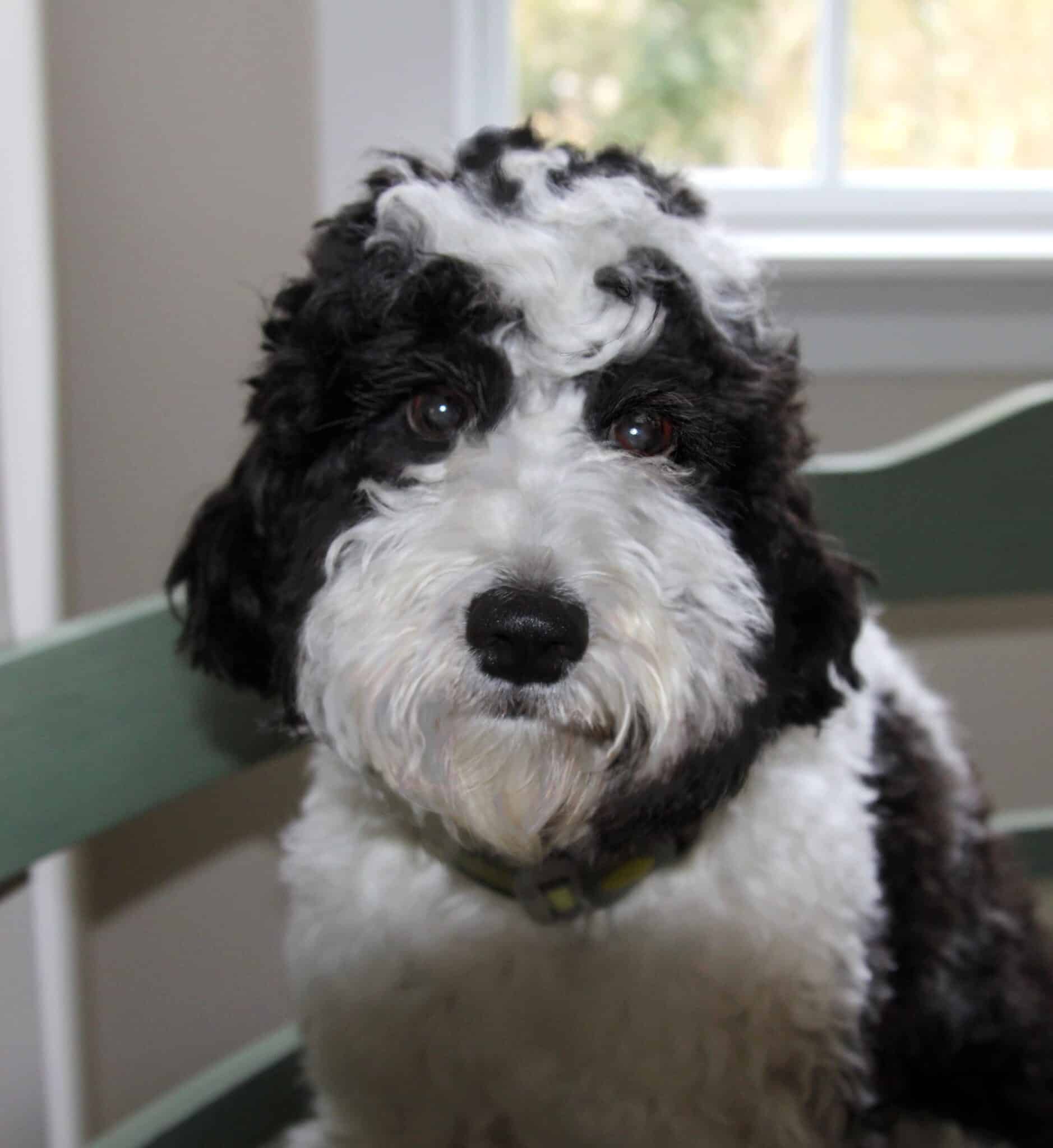 Pasha is our little imp! She brings smiles and laughter to our home in so many ways. She is a small Black and White Parti F1b Multigenerational Australian Labradoodle with a soft wavy fleece coat. All of our parents and their puppies are allergy friendly, low to non-shedding and no odor. Pasha is a dear with a friendly outgoing disposition, excellent conformation, brains and a true beauty. A poster girl for the perfect small family companion. In a word- pure joy!