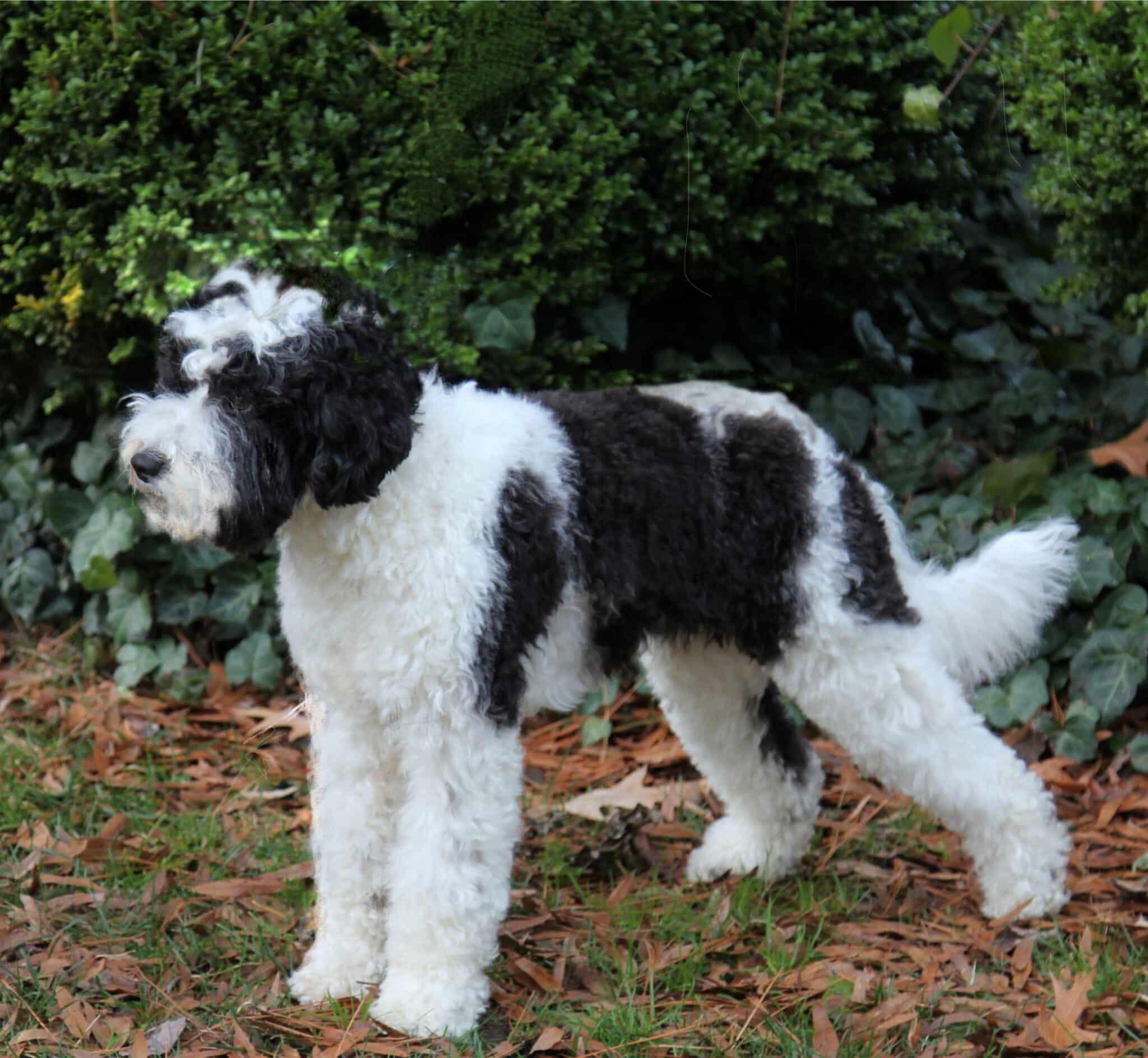 Date of Birth: 14 April, 2022- Color and Coat Type: Black & White Parti; soft wavy fleece coat
