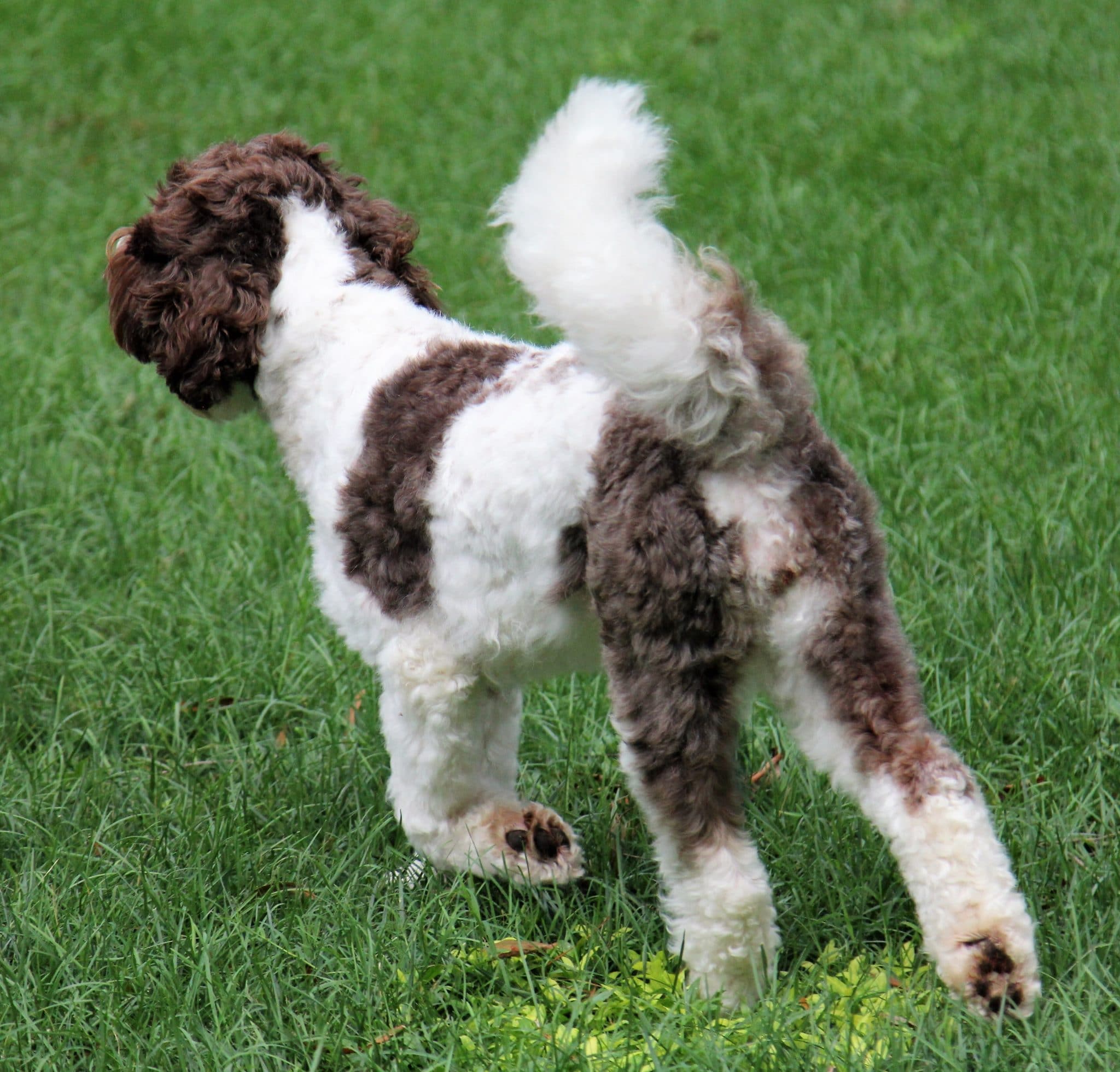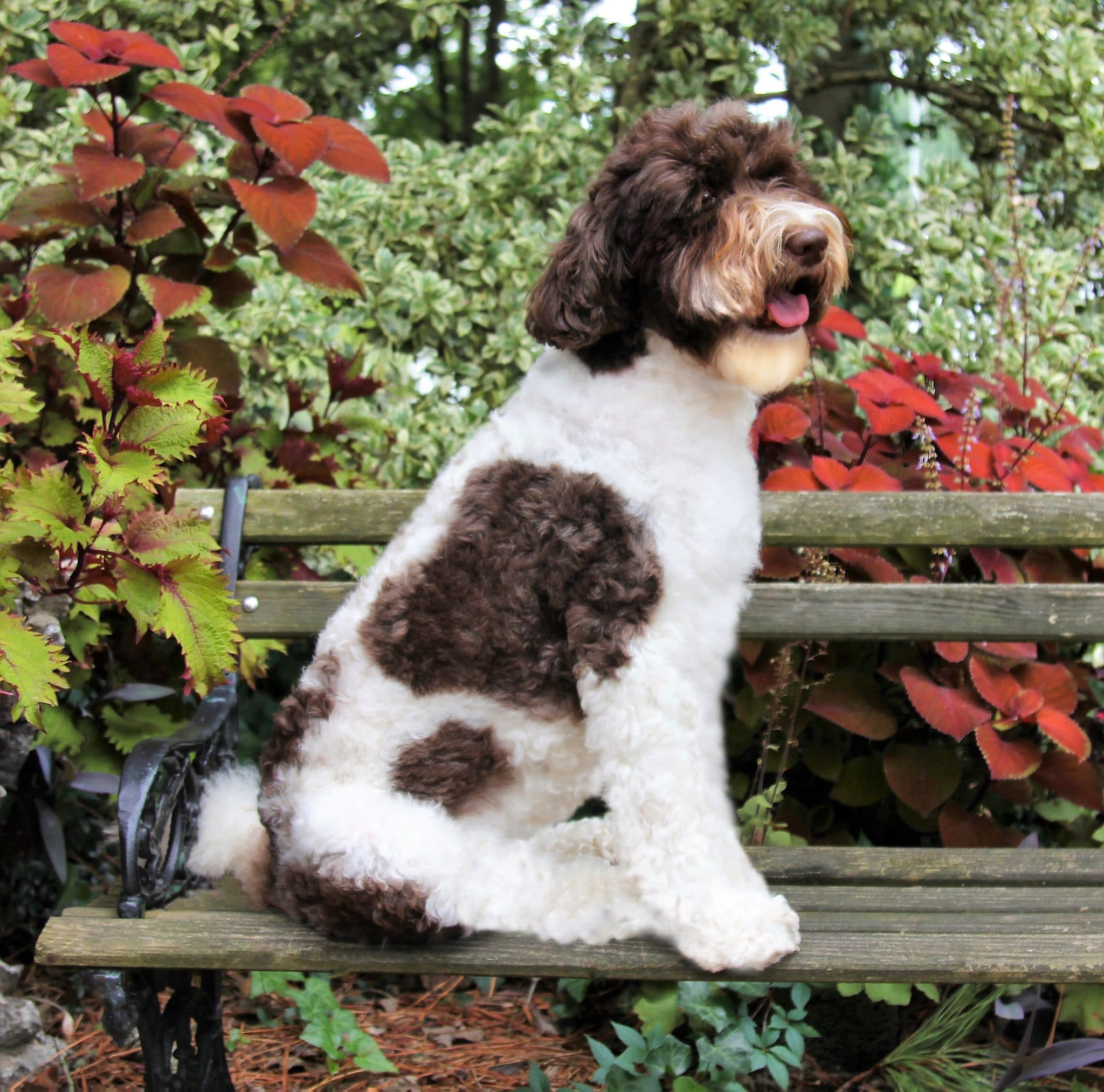 - Color and Coat Type: Chocolate and white, wavy fleece coat, soft loopy curls